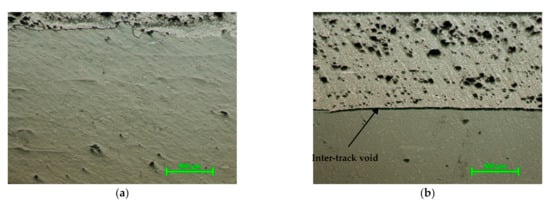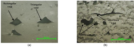 The defects observed in Figure 16a (fiberglass core) are specific to parts manufactured by the FFF process and represent two of the most commonly encountered defects [12,25,50,51]: rectangular and triangular void formation. In Figure 16b, the main defects occurred in the carbon fiber filler (CFRP1), built with a filling density of 60%, were gaps and inter-track voids between the carbon fiber layers. Supplementary void formation (Figure 16b) may be created during the FFF process, as the filament is non-uniform, forming airgaps between tracks [12].