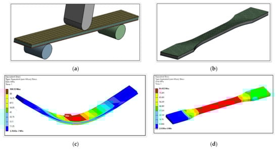 Finite element analysis: (a) FEA model—three-point bending test; (b) FEA model—tensile test; (c) equivalent stress distribution of composite sandwich subjected to three-point bending load; (d) equivalent stress distribution of the composite sandwich subjected to tensile load.