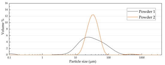 Powder 1 showed a presence of small satellites attached to bigger particles; this is usually caused by a backflow of the gases in the atomization process but should not have any influence on the spray process. The average particle size distribution was measured using a laser device (Mastersizer 3000, Malvern, UK, Figure 1). Powder 1 possessed a rather broad distribution of 11–107 µm (D10-D90) and included a significant proportion of particles smaller than 1 µm. Contrary to this, Powder 2 ranged from 21–59 µm, i.e., an ideal range for thermal spray deposition using RF-ICP.
