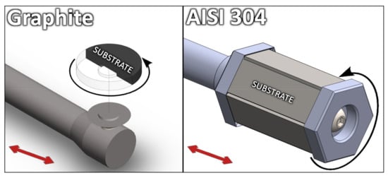 To demonstrate the flexibility of the RF-ICP method, two dissimilar materials were used as substrates: graphite (JAP Industries, Bystrice, Czech Republic) and AISI 304 stainless steel (Italinox, Prague, Czech Republic). The former had a cylindrical shape with a diameter of 60 mm and a height of 10 mm, while the latter had a rectangular shape with dimensions of 60.6 × 20 × 3 mm3 (Figure 2). The chemical composition of the AISI 304 steel is given by the metallurgy standards as 0.07% C, 17.5–19.5% Cr, 8–10.5% Ni, 2% Mn, 1% Si, with the impurities level limited to 0.11% N, 0.05% P, 0.03% S.