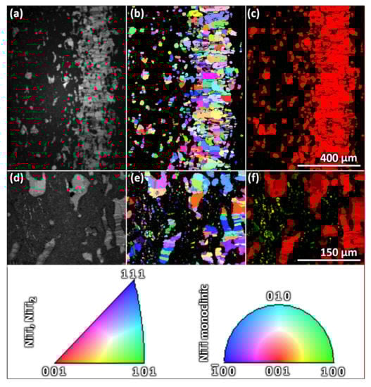EBSD analysis of the produced NiTi coatings (Sample 3 shown for illustration). The top row is a global view of the coating, illustrating gradual distribution of relatively big austenite grains toward the free surface. (a) Image quality map of the entire area, (b) corresponding IPF map showing individual grains overlaid on the grayscale confidence index map, and (c) the corresponding phase map overlaid on the grayscale confidence index map. The bottom row is an enhanced detail showing smaller martensite and NiTi2 grains. (d) Image quality map of the enlarged area, (e) corresponding IPF map showing individual grains overlaid on the grayscale confidence index map, and (f) corresponding phase map overlaid on the grayscale confidence index map. In the phase maps, red, green, and yellow colors denote B2 austenite, B19′ martensite, and NiTi2 phases, respectively. In the dark regions, the signal could not be analyzed (no Kikuchi bands, probably due to too fine microstructure). The legends in the IPF maps pertain to cubic symmetry phases (austenite, NiTi2), and martensite.