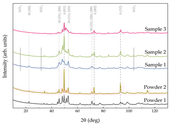Despite the global chemical composition of the coatings nearing the ideal equiatomic, various phases could have appeared in the deposited coatings due to the high thermal input and non-equilibrium conditions the material is subjected to during its deposition. For the NiTi system, these could include the cubic B2 austenite phase, trigonal R-phase and/or monoclinic B19′ martensite phase [] as well as various intermetallic phases. The phase composition of the two NiTi powders and the three coatings produced using different process parameters was measured using X-ray diffraction (Figure 6).