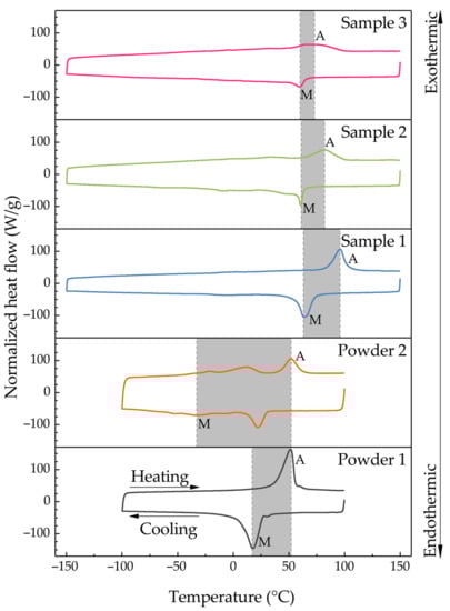 Differential scanning calorimetry analysis of the starting NiTi powders and the three Samples 1–3. Heating (upper part of every curve) and cooling (bottom part) were performed in the range of −100 to +100 °C for Powders 1 and 2 and a maximum range of −150 to 150 °C for the samples. The y-axis represents endothermic/exothermic character of the changes. The peaks of austenite and martensite phases formation are denoted by letters (A, M), and for clarity, the austenite-martensite temperature range is highlighted in light gray color. The small gaps in the curves are caused by beginning/end of the respective measurement cycle.