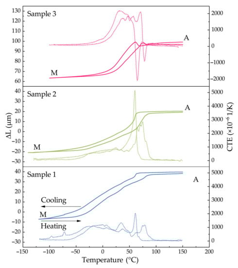Thermo-mechanical analysis of the NiTi Samples 1–3. Displacement ΔL and coefficient of thermal expansion (CTE) as a function of temperature (Displacement (ΔL, dotted curves, left y-axis) and coefficient of thermal expansions (CTE, solid line, right y-axis). Heating (bottom part of every curve) and cooling (upper part) were performed in the maximum range of −140 to +150 °C. Please note the different range of both y-axes for Sample 3.
