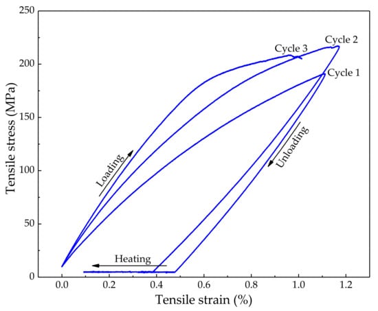 In addition, three-cycle tensile tests of the dog bone-shaped samples were performed, involving loading and unloading at room temperature, followed by a stress-free heating to 100 °C (Figure 10).
