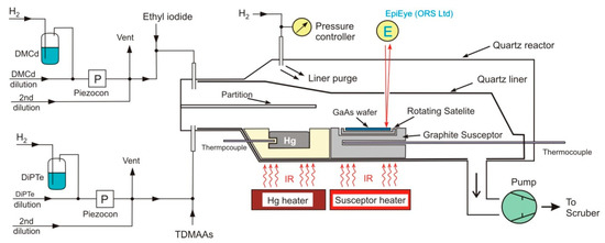 A fragment of the precursors’ delivery installation, together with the horizontal reactor cell scheme with an internal mercury source of the Aixtron AIX 200 MOCVD, designed for HgCdTe deposition.
