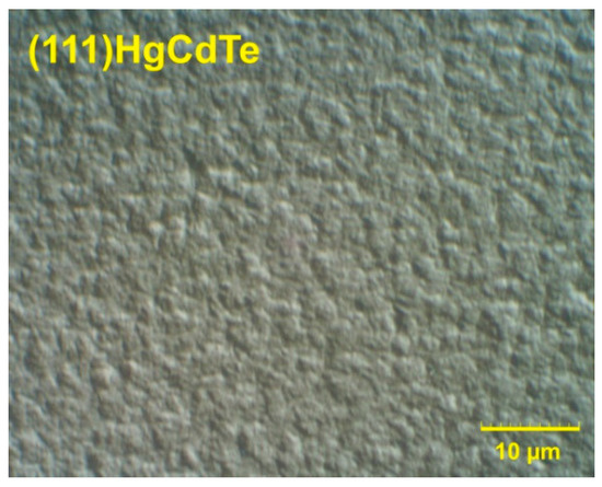 Figure 4 presents the surface morphology of a MOCVD-grown (111) HgCdTe heterostructure, taken with a Nomarski microscope. The heterostructure is a 20-µm-thick MWIR photodiode, and its surface roughness is typically about 40 nm. The rough surface of the CdTe buffer is enhanced and reflected at the on-growing HgCdTe surface. Much effort has been made in order to optimize the growth parameters and to improve the surface quality of the (111) HgCdTe, but the results are still unsatisfactory. On the other hand, the (111) HgCdTe layers were devoid of the troublesome hillocks typical of (100) HgCdTe. A high surface roughness reflects poor crystalline quality, but nevertheless, the (111) HgCdTe heterostructures presented in this paper are good materials for high-performance HOT IR detectors, which is supported by our previous research [13].