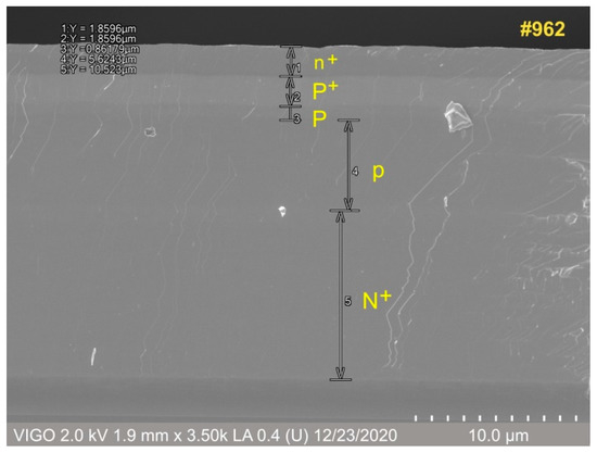 Figure 5 presents the scanning electron microscopy (SEM, Hitachi, Tokyo, Japan) image of the N+/p/P/P+/n+ #962 HgCdTe heterostructure cleavage. The sample was broken along the growth direction. This allowed us to specify the individual component layers, and to measure their thickness. The obtained structure was compared with the designed one (Figure 2). The measured thicknesses were given with 0.01 µm resolution. However, because of the blurred boundaries between the layers, the practical measurement precision was assumed at about 1%, and this was sufficient for our experiments. The graded interfaces between the individual layers were also hardly observed. The measured thickness of the presented MWIR heterostructure was 20.72 µm.