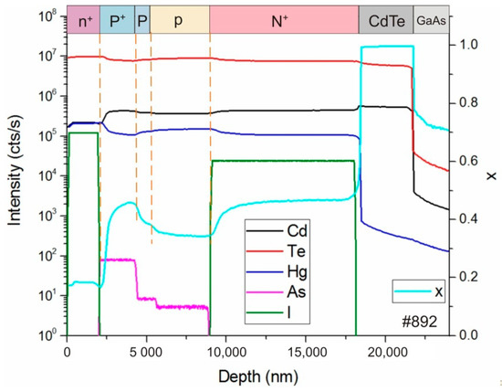 Figure 7 presents the secondary-ion mass spectroscopy (SIMS, Cameca, Gennevilliers, France) profile of the N+/p/P/P+/n+ Hg1−xCdxTe heterostructure with the absorbing region composition x = 0.32. The green line represents iodine counts: 105 and 2 × 104 in the n+ and N+ regions, respectively, which correspond to the designed concentration levels: 1018 cm−3 and 2 × 1017 cm−3, respectively. In general, abrupt transitions were observed in the iodine profile. As a positive consequence, there was no iodine presence in the adjacent layers, especially in the absorber region. The pink line represents the arsenic-stepped profile, corresponding to abruptly increasing doses of the arsenic in successive layers: p, P, and P+. We did not observe any undesirable arsenic diffusion to the adjacent layers, suggesting that arsenic is a stable dopant. The mercury, cadmium, and tellurium counts enabled us to calculate a composition (x) profile (the light blue line) of the whole Hg1−xCdxTe heterostructure. We can see that the narrower gap absorber with the composition x = 0.32 is surrounded by wider energy gap N+ and P+ layers with compositions of around x = 0.46, as assumed in the heterostructure project. Due to the interdiffusive processes in the HgCdTe alloy during growth, a composition profile of the interfaces between the particular layers is not abrupt. Systematic studies of the SIMS results, supported by the theoretical calculations, allow us to make the corrections in the programmed growth recipes, and to obtain the assumed profiles in the real HgCdTe heterostructures.