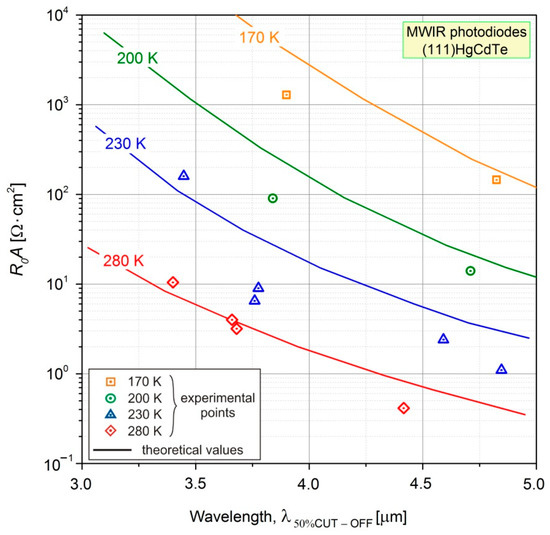 Figure 11 shows a comparison of the R0A product of MWIR HgCdTe detectors, as a function of the 50% cut-off wavelength (λ50%CUT-OFF), with theoretical calculations. Using numerical simulations of I–V characteristics on the SimuApsys platform (Crosslight Inc., Vancouver, BC, Canada)) for a given N+/p/P/P+/n+ heterostructure, the values of the R0A product as a function of cut-off wavelength were calculated at temperatures of 170, 200, 230, and 280 K. The numerical model implemented in the APSYS platform incorporates HgCdTe generation–recombination mechanisms: radiative, Auger, and Shockley–Read–Hall (SRH). The R0A product determined experimentally was consistent with the theoretical values for most of the samples. The dominant contribution to the dark current was from SRH recombination. The reason for the location of some experimental points slightly below or above the theoretical curve was a different value of the SRH lifetime compared to the one adopted in the calculations. Some samples were characterized by much lower values of the R0A product in relation to the theoretical calculations. This is probably due to improper processing and an increase in the share of leakage currents in the total current flowing through the junction.