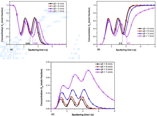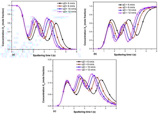 Similar results were obtained in the time-concentration profiles for component D as indicated in Figure 1b; however, the time difference in the second valley of the profiles for qB = 6 and 1 nm/s is 0.6 s. Figure 1c shows that the peak values of component B increased with sputtering time, particularly for a low sputtering rate of component B, e.g., qB = 1 nm/s. This is because more atoms of B remain on the surface due to its low sputtering rate, and the sputtered yield is proportional to its concentration and the individual sputtering rate.