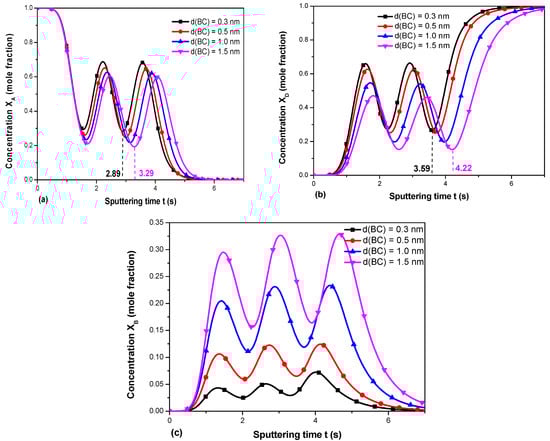 To illustrate the extended MRI model for a periodical multilayer (3×A/BC/D) with a delta layer of BC in each period, the sputter depth profiles were simulated with the same MRI parameters but with different sputtering rates or thickness values of the delta layer. For the following simulation, the original molar concentration of component B in the delta layer of BC was 0.8, the thickness of A layer (dA) was 5 nm, and the total thickness of the BC layer (dBC) and D layer (dD) in each period maintained a constant value of 5.5 nm. For example, the thickness of D layer was 5 nm if the thickness of BC layer was 0.5 nm. To evaluate the influences of the sputtering rate and thickness of the delta layer (BC layer) on the depth profiles of components A and D, the simulations were carried out with constant MRI parameters of w and σ (2 nm). The parameters used for the simulations of Figure 1, Figure 2and Figure 3 are listed in Table 1.