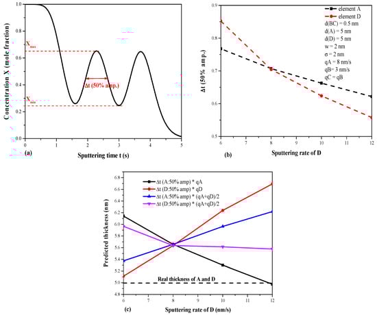 In practice, it is typical to take the FWHM of the measured time-concentration profile as the layer thickness by Δt(50%)*q(sputtering rate). The FWHM, i.e., Δt(50%) in the time-concentration profile is the time difference corresponding to 50% of the amplitude of each layer as shown in Figure 4a. However, based on the above simulation, the total sputtering time for the whole multilayer decreases with increasing the sputtering rate of element D so that the FWHMs of elements A and D decrease too as shown in Figure 4b. According to the simulation results of Figure 3a,b, the layer thickness values of elements A and D determined by Δt(50%)*q(sputtering rate) are displayed as a function of the sputtering rate of element D in Figure 4c.