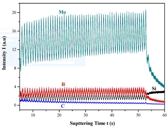 The experimental conditions of the pulsed RF GDOES measurement were as follows: argon pressure of 550 Pa, sputtering power of 17 W (corresponding to the average Ar+ sputtering energy of 50 eV), pulse frequency of 5 KHz, and duty cycle of 0.25. The emission intensities of excited sputtering atoms at 386.411 nm (Mo), 251.611 nm (Si), 249.678 nm (B), and 156.144 nm (C) wavelengths were recorded as a function of the sputtering time, and the results of the measured GDOES depth profile are displayed in Figure 5.