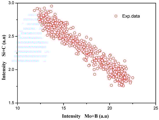 When depth profiling a multilayer and analyzing sputtered elements, as in SIMS and GDOES depth profiling, a matrix effect may exist [,]. To investigate whether a matrix effect exists in this GDOES depth profiling of Mo/B4C/Si multilayer, the plot of the intensity of Mo + B against that of Si + C is displayed in Figure 6. The obtained straight line implies that the sensitivity factors at each point of experimental data are almost the same, indicating no matrix effect at all in this GDOES depth profiling of the Mo/B4C/Si multilayer.