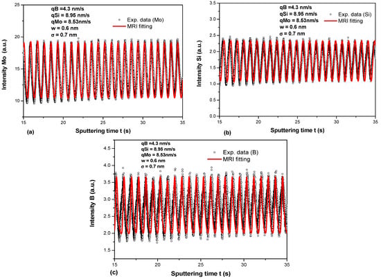 With respect to the MRI parameters used for simulation, the atomic mixing length of w can be obtained by the Stopping and Range of Ions in Matter (SRIM) calculation [,]. From the SRIM code for Ar ions with an energy of 50 eV, the w values for the elements Mo, Si, and B(C) are 0.3, 0.8, and 0.6 nm, respectively. The roughness parameter σ can be measured by Atomic Force Microscopy (AFM), which is 0.7 nm after the sputtering of 30 periods for the Mo/B4C/Si multilayer [].