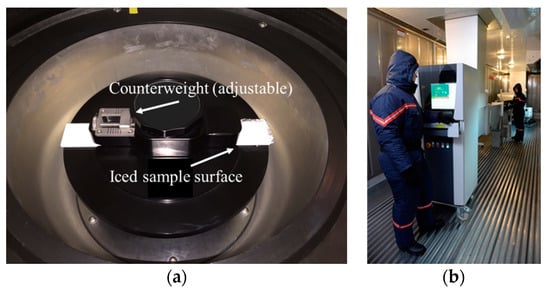 For the evaluation of icephobic performance, an ice adhesion test using a custom-made centrifuge was selected. Ice adhesion reduction is an important function of icephobic coatings as ice may form but, upon reaching a critical mass, it should be able to be easily removed from the surface. There are no available standards for this type of test, and many different methods have been developed to assess the ice adhesion reduction in icephobic coatings [12,15,16,27,28]. The centrifuge test uses centripetal forces to shear ice from the test surface. Fraunhofer IFAM uses a centrifuge with a modified rotor to place and fasten the prepared beam with the ice in the device [14]. Opposite the ice is a counterweight that can be adjusted, according to the ice mass, to reduce vibrations (see Figure 2a). The centrifuge runs in an ice lab that was cooled to −8 °C during the tests (Figure 2b).
