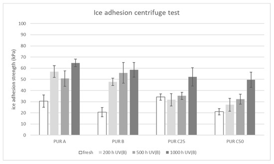 For coatings PUR A and PUR B, a clear increase in the ice adhesion strength was obvious after 200 h of UV exposure, with further UV exposure leading to no further increase. For coatings PUR C25 and PUR C50, a significant increase in ice adhesion strength was observed after 1000 h of UV exposure, keeping in mind that the values are still at a low level (around 50 kPa).