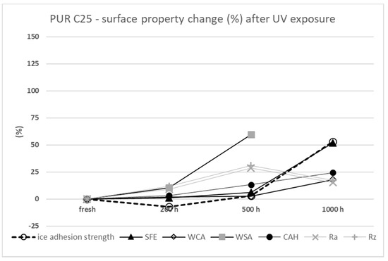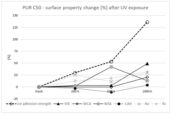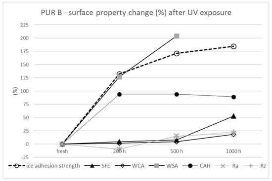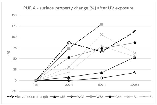 The percentage change in the ice adhesion strength after 200 h of UV ageing was >125% for PUR B. Again, the WSA indicated the performance change best, but indicates overestimation of the further increase in the ice adhesion strength beyond 200 h of UV exposure. There was no further significant change in ice adhesion strength after 500 h and 1000 h of UV ageing (compare, also, with Figure 4); the CAH correlates well with this finding. The parameters WCA, SFE, Ra, and Rz were not correlated with the percentage change of the ice adhesion strength for PUR B.
