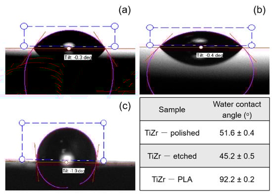 The contact angle measurements show that the polished and etched TiZr samples (Figure 2a,b) have hydrophilic characteristics. The decrease of the contact angle value for the etched TiZr surface can be attributed to an increased oxygen quantity caused by the formation of the oxides, leading to more hydrogen bond interactions between the oxygen-rich Ti and Zr compounds and water [31]. PLA is a relatively hydrophobic polymer with a static water contact angle in the range of 75–85° [32]. Surface micro and structures affect the contact angle values and, in combination with a hydrophobic material, they increase it. Briefly, covering the TiZr surface with PLA nanofibers (Figure 2c) led to an increase of the contact angle value, crossing the limit of hydrophobicity which is an aspect of our aim in this manuscript.