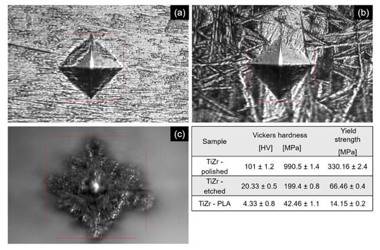 Morphology of samples after microhardness tests: (a) polished TiZr; (b) etched TiZr; (c) etched TiZr covered with PLA nanofibers and calculated forces.