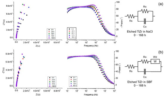 With EIS one is able to characterize oxide layers on the studied materials and assess the performances of surface layers without accelerating the electrochemical reactions at a sample/solution interface [34]. The evolution of the samples was monitored for a period of 7 days of immersion in two electrolytes (0.9% NaCl and SBF). Figure 4 presents the EIS spectra (Nyquist and Bode Phase) and equivalent circuits used to fit the collected data for the etched TiZr samples. The values obtained after fitting are presented in Table 3.