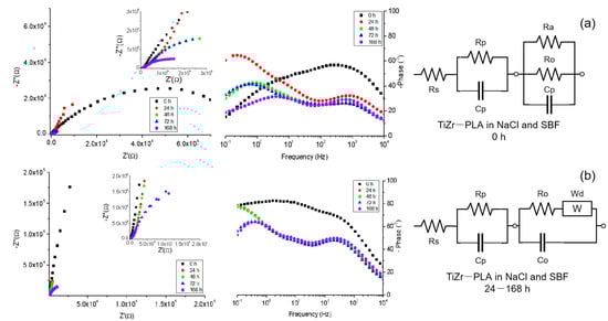 Figure 5 presents the EIS spectra (Nyquist and Bode Phase) and equivalent circuits used to fit the collected data for the TiZr–PLA samples. The values obtained after fitting are presented in Table 4.