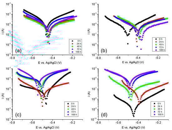 Tafel plots over time for (a) etched TiZr in 0.9% NaCl; (b) etched TiZr in SBF; (c) etched TiZr covered with PLA nanofibers in 0.9% NaCl; (d) etched TiZr covered with PLA nanofibers in SBF.