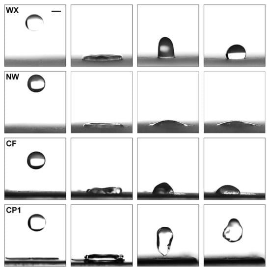 - Jung, Y.C.; Bhushan, B. Dynamic effects of bouncing water droplets on superhydrophobic surfaces. Langmuir 2008, 24, 6262–6269. [Google Scholar] [CrossRef] [PubMed]