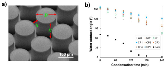 - Sojoudi, H.; Kim, S.; Zhao, H.; Annavarapu, R.K.; Mariappan, D.; Hart, A.J.; McKinley, G.H.; Gleason, K.K. Stable wettability control of nanoporous microstructures by iCVD coating of carbon nanotubes. ACS Appl. Mater. Interfaces 2017, 9, 43287–43299. [Google Scholar] [CrossRef]