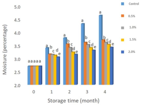 Changes in the moisture content (%) of uncoated (control) and coated almond kernels during 4 months of storage. Different lowercase letters indicate a statistically significant differences (p < 0.05) between the samples during each month; share a lowercase letter are not statistically different, while different letters denote for statistical differences at least 95% confidence.
