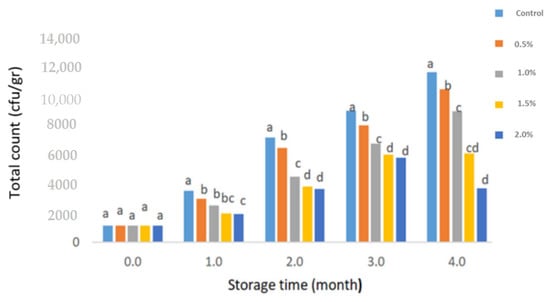 Changes in TYMC load of uncoated (control) and coated almonds with mastic gum in different concentrations during 4 months storage. Different lowercase letters indicate a statistically significant differences (p < 0.05) between the samples during each month; share a lowercase letter are not statistically different, while different letters denote for statistical differences at least 95% confidence.