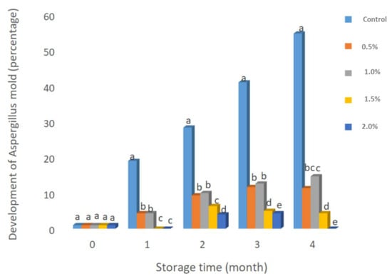 Percentage of the growth of Aspergillus species on almond uncoated (control) and coated with different concentrations of mastic gum during 4 months of storage. Different lowercase letters indicate a statistically significant differences (p < 0.05) between the samples during each month; share a lowercase letter are not statistically different, while different letters denote for statistical differences at least 95% confidence.