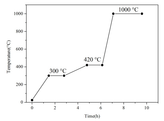 We added 2.9 wt.% aluminum, 24.06 wt.% iron, 25.35 wt.% nickel, 25.35 wt.% cobalt, 22.34 wt.% chromium powders with an average particle size of 2 μm, and 99.9 wt.% purity to a ball mill (YXQM-4L) (MITR, Changsha, China). Prior to ball milling, polyethylene glycol was added to mixed powders with a mass ratio to the powders of 1:100. The ball mill parameters are shown in Table 1. After ball milling, the powders were dried for 20 h in a drying chamber (DZ-1BCIV) (Taiste, Tianjin, China) at 100 °C. The powders were then sintered with a vacuum furnace (ZM-30-16) (Chenhua, Shanghai, China), ground with a mortar, and sieved with a 60-mesh stainless steel sieve. Afterward, 30 wt.% Al0.25FeNiCoCr powders and 70 wt.% FeB powders with a particle size ranging from 1 to 5 μm with 99.9 wt.% purity were ball-milled. FeB-30 wt.% Al0.25FeNiCoCr powders were prepared through the same approaches used for Al0.25FeNiCoCr powders, apart from the ball milling time of 3 h, a ball ratio of 3:1, and a sieve of 400 mesh. The vacuum sintering process of Al0.25FeNiCoCr powders and FeB-30 wt.% Al0.25FeNiCoCr powders is shown in Figure 1.