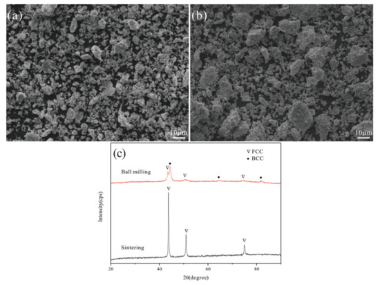 Morphologies and phase compositions of Al0.25FeNiCoCr powders after ball milling 50 h and vacuum sintering: (a) ball milling, (b) vacuum sintering, and (c) phase compositions.