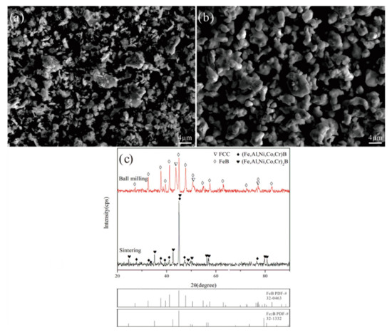 Morphologies and phase compositions of FeB-30 wt.% Al0.25FeNiCoCr powders after ball milling and vacuum sintering: (a) ball milling, (b) vacuum sintering, and (c) phase compositions.
