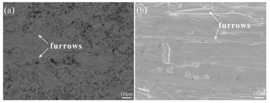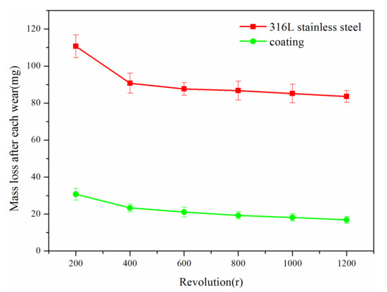 As shown in Figure 5a, furrow-like wear marks appeared on the coating after the abrasion wear test because a small amount of particles in the coating peeled off due to abrasive particles, and some holes formed on the surface of the coating. These particles further wore the coating and formed more furrow-like wear marks. Figure 5b shows the surface morphology of the 316L stainless steel substrate after the abrasion wear test. It can be seen that there are more furrow-like wear marks on the substrate than on the coating. Figure 6 is a graph showing the relationship between their mass loss after each wear and the revolutions. Since the coating and substrate initially had high surface roughness, their mass loss was large after the first wear, and then gradually reduced. Compared with the substrate, the abrasion wear resistance of the coating was significantly improved, being three times as much as that of the substrate.