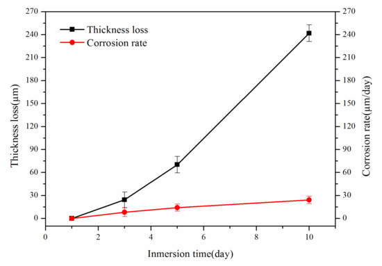 According to Equation (2), the corrosion rate of the coating was calculated by measuring the thickness change of the coating immersed in 450 °C liquid zinc for 1, 3, 5, and 10 days. Figure 7 is a diagram of the relationship between thickness loss, corrosion rate, and corrosion time. The corrosion rate of this coating in liquid zinc bath at 450 °C was 24.19 μm/day, which is lower than that of 316L stainless steel in liquid zinc bath at 460 °C with a value of 115.44 μm/day [39]. Figure 7 shows that the coating thickness did not change in the initial period, indicating that the coating still maintained good resistance to liquid zinc. However, with the immersion time extended to 3 days, the thickness loss and corrosion rate of the coating began to increase. In the period of 5 to 10 days, the thickness loss of the coating increased significantly, and the corrosion rate increased gradually. At this time, the corrosion resistance to liquid zinc was considerably reduced.