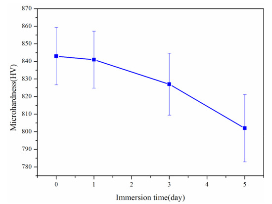 Figure 8 shows the interface morphology of the coating immersed in liquid zinc for various times. During immersion in liquid zinc, as shown in Figure 9, the relationship between the microhardness of the coating near the liquid zinc and immersion time is closely related to the corrosion process near cracks. After immersion for 1 day, liquid zinc and the coating maintained a good boundary, but micro-cracks were generated under the influence of residual stress and thermal stress, and the microhardness of the coating near the liquid zinc was almost the same as that of the coating before immersion in liquid zinc. Micro-cracks grew into macro-cracks, and liquid zinc more rapidly invaded into the coating along macro-cracks after being immersed for three days. In addition, liquid zinc was filled in these macro-cracks, causing local stress concentration and promoting the propagation of cracks. In turn, this caused more coating to peel off. A small amount of elements such as Fe in the coating were dissolved by liquid zinc to form porous corrosion products like δ phase (91.3 wt.% Zn, 6.62 wt.% Fe, 0.21 wt.% Al, 0.68 wt.% Ni, 0.61 wt.% Co, and 0.58 wt.% Cr), which can fix peeled coatings to resist the corrosion by liquid zinc. The porosity of the coating near the liquid zinc increased and the microhardness value of the coating decreased. After soaking for 5 days, the speed at which the coating peeled off was accelerated, and more coating fell off and flowed into liquid zinc. The pores of the coating near the liquid zinc continued to increase, and the microhardness value further decreased. After immersing for 10 days, the coating was almost completely eroded by liquid zinc, and the remaining coating was too thin to test its microhardness value, but the substrate was not affected by liquid zinc and remained intact.