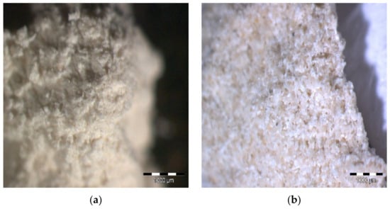 Blocks (5 cm × 5 cm × 1 cm) were prepared with lime putty and limestone dust in a ratio of 1:3. Vinci limestone powder was selected as an aggregate: it is entirely composed of calcium carbonate and was sieved to select aggregates with ≤200–300 μm3 dimensions (Figure 2). A plaster rasp was used to imitate the tooth chisel processing, obtaining a material which was similar to the constituting stone of the bodies of the Virgin and the Child, from a chemical and morphological point of view, as verified by an optical microscope. Since the polychrome stratigraphy of the work of art is very complex and extremely heter-ogeneous, a simplification was implemented to realise the mock-ups, even though in our opinion their representativeness was not compromised. Therefore, rather than reproducing all the layers of each area of the sculpture, only two pictorial layers were prepared. One was composed of red ochre, white lead and siccative oil (linseed oil), the other consisted of yellow ochre, white lead, and animal glue. The two pictorial layers were spread by brush on sheets of Melinex®; once dried, they were peeled off and subjected to artificial aging. During the present case study, the artificial aging in the stove lasted twenty-two days: for eleven days the temperature was kept at 60 °C and then at 110 °C for another eleven days. Following this treatment, it was possible to observe a notable stiffening of the pictorial layers and a slight variation in the colours.