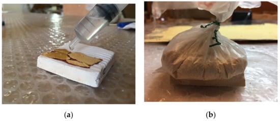 Each product tested was applied on a mock-up composed by the block representing the lithotype, covered by an oil painting layer and, on top, one tempera layer, both laid in fragments. The tested products were applied by syringe, allowing them to penetrate between the layers (Figure 3). The effectiveness of the organic resins was evaluated three to four days after the first application; in the case of a visible inefficacy, the product was applied a second time. Inorganic consolidants were applied four to six times. Regarding the case of nanolime, the tape test was performed thirty days after its application. Regarding each product to be tested, three pieces of Scotch® 3M were applied in three different points on the surface of each sample and then de-attached. After this, the average weight difference between the piece of tape after and before the application was calculated, using an Acculab ALC-210.4 analytical balance (Acculab, New York, NY, USA), with readability 0.1 mg. The lower the resulting value, the greater the adhesive strength of the product. The mock-ups were photographed before and after the test (Table A1, Appendix A), to see and record which layers adhered and, consequently, to evaluate the penetration capacity of the products among the different interfaces.