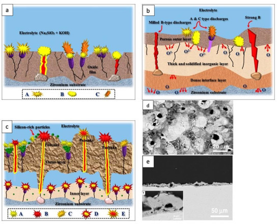 After this, the authors pursued the PEO process by investigating the influence of sparking regimes on the phase composition and morphology of the coating produced on Zircaloy-2 [25]. They found the pancake-like feature prevailed the surface morphology of the PEO coating produced after 1 min. These features were formed because of type B discharges, illustrated schematically in Figure 3b. As mentioned, type B discharges were the strongest discharges during the PEO process originating from near the substrate/coating interface. Increasing treatment time caused enlarging dimensions of the pancake-like structures due to being struck by stronger discharges. Moreover, the detection of some pores on the dense outer layer surface and the porous inner layer could be ascribed to creating type D and type E discharges, as shown in the schematic model in Figure 3b. Moreover, the PEO coating composition altered with the silicate concentration in the electrolyte. The m-ZrO2 dominated the coating in dilute silicate electrolyte, and t-ZrO2 content increased at higher silicate concentration.