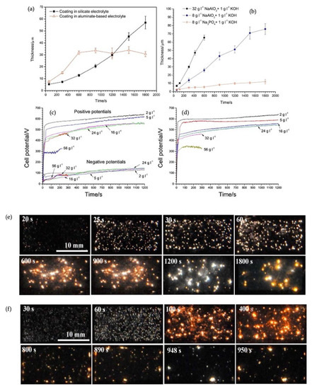 (a) Dependence of coating thickness on time of PEO on Zircaloy-2 in silicate and aluminate electrolytes and concentrations [26]; (b) Dependence of coating thickness on time of PEO on Zircaloy in different concentrations of aluminate electrolyte [27] (reproduced with permission number: 5043480179625 and 5043510569542, Elsevier); (c) and (d) Chronopotentiograph for the PEO process on Zirlo alloy in aluminate electrolyte with different concentration for pulse bipolar and pulse unipolar regimes, respectively [33] (reproduced with permission number: 5043511188587, Elsevier); (e) and (f) discharge appearances at different times of PEO in the silicate and aluminate electrolytes, respectively [26] (reproduced with permission number: 5043480179625, Elsevier).