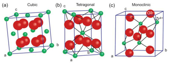 (a–c) Crystal structures and crystallographic information for monoclinic, tetragonal, and cubic phases in ZrO2, respectively [63] (reproduced with permission number: 5055990208243, Elsevier).