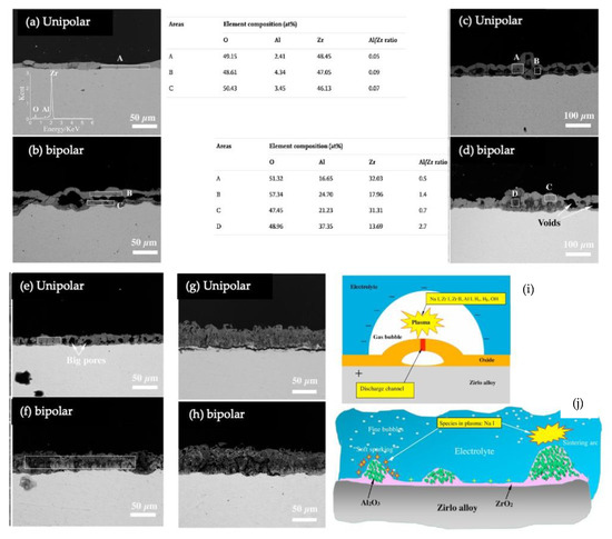 The effect of anion deposition in different concentrations of aluminate electrolyte was studied by Cheng et al. [41]. The surface morphology of coatings was examined for the entire various concentration of aluminates used in electrolytes. First, in dilute electrolyte with 2 g/L NaAlO2, the pancake-like features were reported for both unipolar and bipolar conditions, in which each pancake contained a pinhole at the center due to the outlet of gases accumulated under the pancake-like features created by the strong discharges (type E) [10,38]. Figure 8 illustrates cross-sectional images of all PEO coatings formed at NaAlO2 concentrations of 2, 16, 32, and 56 g/L. The coating thickness formed during the bipolar regime was very thin (~10 µm) and exhibited a single-layer nature in the cross-section shown in Figure 8a. However, the coating formed under a unipolar regime was a bi-layered structure with a thickness of ~30 µm. Remarkably, large lateral pores trans passing the compact outer layer and the thin inner layer were apparent for the coating formed in an electrolyte containing 2 g/L NaAlO2, as shown in Figure 8b. The cross-sectional images for coating formed in 16 g/L NaAlO2 under unipolar and bipolar regimes were different, as shown in Figure 8c,d. The unipolar structure resembled the structure formed in a dilute electrolyte, in which internal pores were detected. In contrast, the intervals between outer and inner layers in the bipolar coating were filled with dark coating materials instead of being void, as shown in the central part of Figure 8d. EDS analysis for areas shown in figures is shown in Figure 8. The ratio of Al/Zr highlighted the fact that the concentration of aluminate in electrolytes greatly influenced the proportion of anions incorporating into the coating. For coatings formed in an electrolyte containing 32 g/L NaAlO2, the cross-section image of the coating formed under a unipolar regime illustrated the presence of big pores and generated interruption in the continuity of the coating, similar to coatings formed in dilute electrolytes. In striking contrast, the surface morphology of bipolar coating did not show pancake-like structures. At the same time, some white patches appeared on the surface of the bipolar coating. The coating growth behavior altered significantly for the PEO process is highly concentrated aluminate electrolyte (56 g/L NaAlO2), in which the entire surface covered with patches of white materials deposited at a high rate. A prolonged process at highly concentrated electrolyte caused alteration of the morphology distinguishably. The pancake-like features disappeared from the coating surface. The surface of coatings contained noodle-like features. The surface morphology was extremely nonuniform for the unipolar regime, while mound-like features were created by a “sintering arc” being completely visible. The thickening of the coating under the unipolar regime, shown in cross-sectional images in Figure 8g, represented an extraordinary behavior due to protruding mound-like features. Moreover, the appearance of long cracks at the coating–substrate interface indicated the weak adherence of the coating. In contrast, the coating formed under the bipolar regime was more uniform. With no mound-like features appearing, the cross-section of coating indicated greater uniformity, and interfacial cracks did not progress [33].