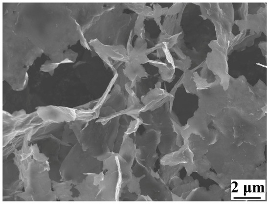 Commercial Al2O3 powders with a nominal size of 60 nm and 400 nm (Yingrui Science and Technology Ltd., Anhui, China), and multi-layered graphene nanoplatelets (GNPs, Sinopharm Chemical Reagent Co., Ltd., Shanghai, China) with a nominal length of 5–10 μm and thickness of less than 10 nm (Figure 1), were used as raw materials. The Al2O3/GNPs composite feedstock powders were prepared by a spray-drying process. Prior to spray drying, nano-sized Al2O3 powders (the ratio (in wt.%) of 60 nm Al2O3 to 400 nm Al2O3 was optimized to 3:2) and 1 wt.% GNPs were evenly dispersed in an aqueous organic binder PVA (polyvinyl alcohol) to form a slurry. The proportion (in wt.%) of Al2O3, GNPs, and PVA in the slurry was 98.65%, 1%, and 0.35%, respectively. The reason for using a mixture of Al2O3 powders with two sizes was to facilitate the uniform dispersion of nano-sized Al2O3 and the adsorption of GNPs on Al2O3 particles within slurry. Then, the slurry was spray-dried to obtain spherical Al2O3/GNPs composite powders with a size range from 15 to 45 μm. The spray-dried Al2O3/GNPs powders without any further heat treatment were referred to as AG powders. In order to investigate the effect of powder heat treatment on the GNPs retention and performance of Al2O3/GNPs coatings, a portion of spray-dried Al2O3/GNPs powders were heat-treated. The heat treatment of AG powders was performed under argon atmosphere for 2 h at 850 °C and 1280 °C, respectively, with a heating rate of 5 °C min−1. The AG powders, heat-treated at 850 and 1280 °C, were referred to as AG850 and AG1280 powders, respectively. For comparison, commercial fuse-crushed Al2O3 powders with a size range of 15–45 μm were also used for coating deposition to investigate the effect of GNPs incorporation on the electrical conductivity of Al2O3 coating.
