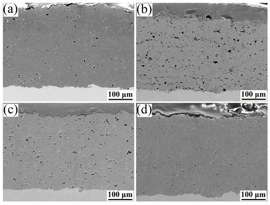 Microstructure of the polished cross-section for different coatings: (a) Al2O3 coating; (b) AG coating; (c) AG850 coating; and (d) AG1280 coating.