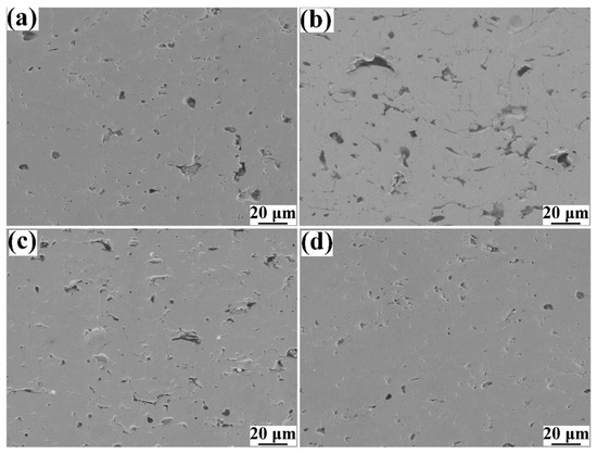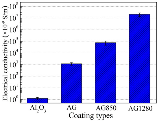 Figure 12 presents the electrical conductivities of plasma-sprayed Al2O3, AG, AG850, and AG1280 coatings. Evidently, the electrical conductivity of the coating increased with the increase in the powder heat-treatment temperature. That is, the electrical conductivity of the Al2O3/GNPs coating increased from 1.24 × 10−9 S m−1 of Al2O3 coating to 1.18 × 10−6, 7.68 × 10−5, and 2.06 × 10−2 S m−1 for the AG, AG850, and AG1280 coating, respectively, i.e., ~3 orders, 4 orders, and 7 orders of magnitude higher than that of Al2O3 coating. This is mainly due to the improved interface bonding and well-preserved GNPs within the Al2O3/GNPs coatings using AG powders with a high heat-treatment temperature. It has been reported that the electrical conductivity of plasma-sprayed coatings is primarily dependent on their inter-lamellar bonding [20,34,35,36]. In general, the current conduction is interrupted by the un-bonded interfaces, leading to the poor electrical conductivity of plasma-sprayed coatings compared to the corresponding bulk materials. In terms of the AG1280 coating, its high density, low porosity, and good inter-lamellar interface bonding contributed to its smooth electrical conduction. Moreover, the GNPs trapped between lamellae acted as bridges, favoring electrical conduction between lamellae. The well-dispersed GNPs may also form a connected network throughout the entire coating, allowing for the current flow across the GNPs–GNPs contacts [23]. In contrast, in the case of the AG coating, its weak interface bonding and few preserved GNPs resulted in a low electrical conductivity. Notably, the limited increase in the electrical conductivity of AG1280 coating compared to the reported values is likely due to the few added GNPs [20,23].