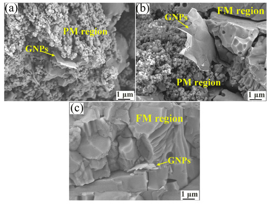 The fracture surface morphologies of the plasma-sprayed AG, AG850, and AG1280 coatings were characterized to check the retention of GNPs within these coatings, and the results are shown in Figure 7. Graphene nanoplatelets, exhibiting dimensions close to that in the original pristine GNPs (Figure 1), were found to be homogenously, and successfully incorporated into the AG (Figure 7a), AG850 (Figure 7b), and AG1280 coatings (Figure 7c). Evidently, for the AG coating, a large amount of partially molten (PM) regions were present within the coating, indicating the low melting degree of AG powders during the in-flight process. This is likely resulted from the poor thermal conduction of AG powders without heat treatment, eventually leading to the porous nanostructure in the original AG feedstock retained within the AG coating. That is, most of the agglomerated AG powders were only sintered in solid state during the plasma-spraying process, especially for the core of the powder [28]. Consequently, a porous structure with plenty of voids was obtained for the AG coating. Nevertheless, in terms of the AG 850 coating (Figure 7b), the proportion of the fully molten (FM) region was enhanced compared to that of the AG coating. Likewise, the FM region was further increased within the AG1280 coating and the nanostructure in the original agglomerated feedstock basically disappeared (Figure 7c). These results revealed that, with the increase in the powder heat-treatment temperature, a higher melting degree of powder during their in-flight process was achieved, resulting in improved coating density.