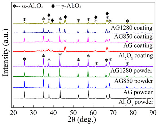 XRD analysis was conducted for the plasma-sprayed Al2O3, AG, AG850, and AG1280 coatings, as well as their corresponding feedstock, to investigate the effect of powder heat treatment on the phase constitution of the coatings. As shown in Figure 8, only characteristic peaks of α-Al2O3 were detected within all four types of Al2O3, AG, AG850, and AG1280 feedstock. In the case of the four types of plasma-sprayed coating, typical diffraction peaks of γ-Al2O3 phase were also detected, apart from the α-Al2O3 phase, compared to that of the corresponding feedstock. This phenomenon was reported to be attributed to the rapid non-equilibrium solidification of molten α-Al2O3 splats during the formation of lamellae [4,28,29]. Moreover, the content of the γ-Al2O3 phase within the coating exhibited an evident upward trend with the increase in the heat-treatment temperature of the feedstock. This is because, for the AG1280 coating, a majority of the original alumina melted, to transform into γ-Al2O3 during their rapid solidification process. On the contrary, in terms of the AG coating, the low melting degree of AG powders during the spray process resulted in a large amount of α-Al2O3 phase in the feedstock remaining in the resultant coating. This is consistent with the above-demonstrated fracture surface results for different coatings. Notably, diffraction peaks of graphene were not detected for the four types of feedstock and coatings, due to their very small incorporation quantities. Moreover, the XRD peaks of Al4C3 phase were also not observed, indicating the absence of reaction between alumina and graphene during the plasma-spraying process.